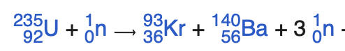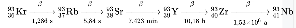 Le premier Krypton stable est Kr86 et donc le Kr93 a 7 neutrons en trop. De même le Ba140 a 2 neutrons en trop et ces deux éléments sont donc instables et vont se désintégrer, les neutrons en excès se transformant en un proton et un électron, lesquels électrons sont expulsés du noyau, (rayonnement bêta), selon l'équation ci-dessous. Le 9341Nb est stable. :