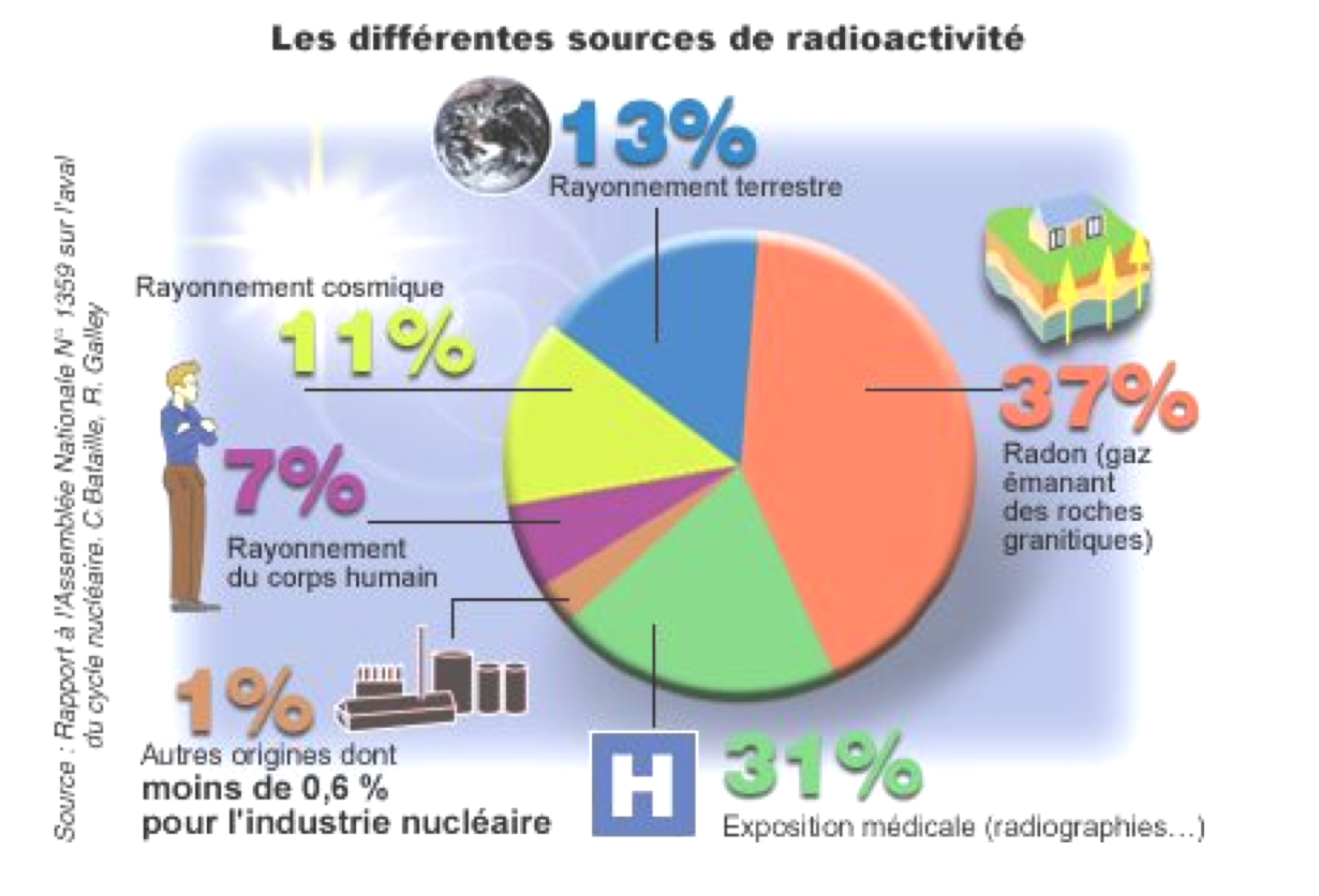- d'abord nous sommes soumis à de nombreux rayonnements ionisants et ceux provenant de l'industrie nucléaire, pour les personnes qui y sont exposées, sont peu importants (moins de 0,6 % cf figure ci-dessous).