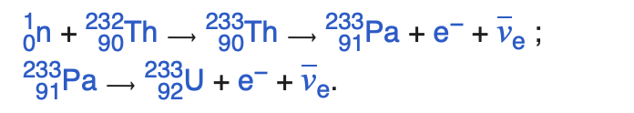 Le thorium 232 n'est pas lui même fissible, mais sous l'effet de neutrons lents ou rapides, il se désintègre selon les équations : (où νe. est un neutrino) :