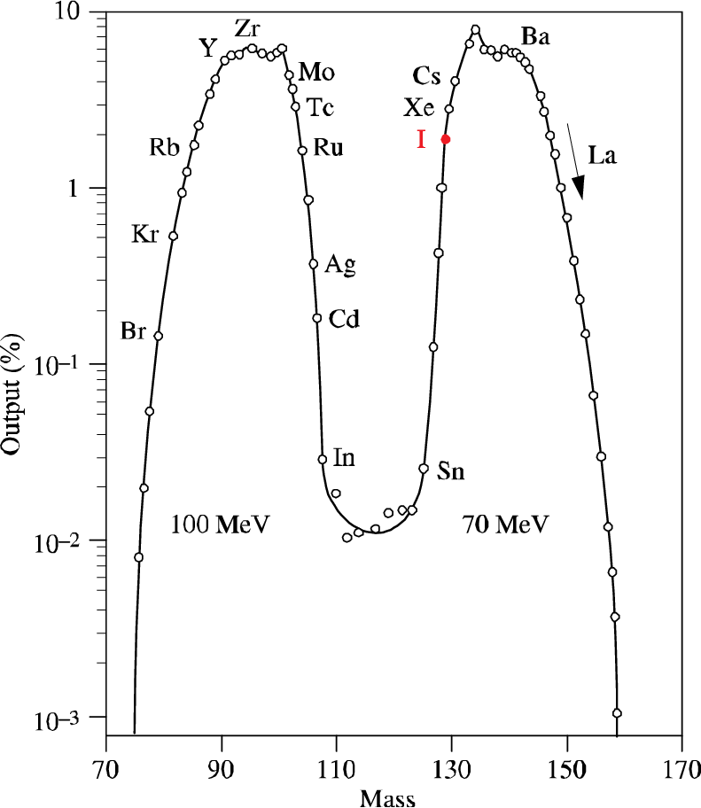 Le noyau d’uranium ou de plutonium se fragmente généralement en deux morceaux de tailles inégales : un noyau léger comportant de 80 à 110 nucléons et un noyau plus lourd de 130 à 155 nucléons. La répartition des produits de fission dépend peu du noyau qui a fissionné : uranium-235 ou plutonium-239. La courbe ci-dessous donne une idée de cette répartition.