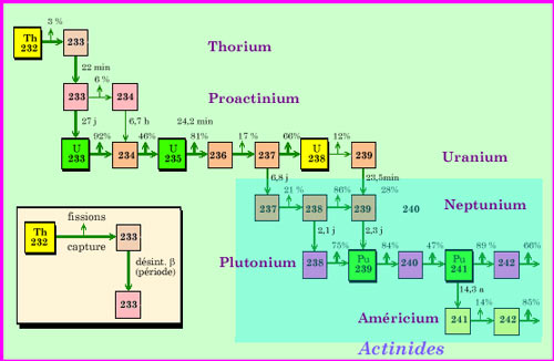 L'autre avantage du Thorium est de donner naissance à des actinides mais dont la plupart sont fissiles aux neutrons rapides ou dont la désintégration aboutit à des éléments plus stables..