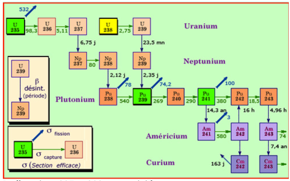 Mais d'autres produits radioactifs sont aussi produits, du fait que tous les neutrons rapides ne sont pas tous ralentis et ils agissent alors sur l'uranium en donnant des produits de désintégration. Ce sont des éléments lourds isotopes de plutonium, de neptunium, d’américium et de curium, appelés actinides.qui sont peu radioactifs mais avec des vies très longues. La carte ci dessous donne un aperçu des réactions de désintégration.
