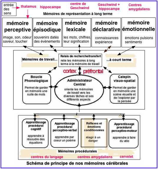 Si nous reprenons notre schéma des mémoires nous voyons que nous avons quatre types principaux de mémoires procédurales que j'ai évoquées ci dessus :